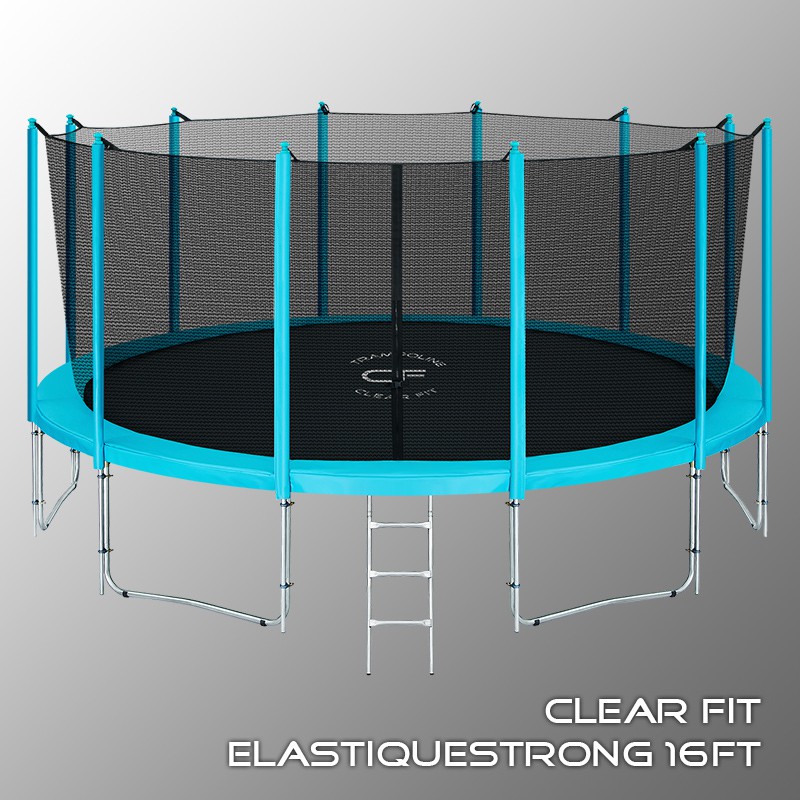 Батут Clear Fit ElastiqueStrong 16ftБатуты Clear Fit серии ElastiqueStrong — это современные батуты из качественных комплектующих. Каркас батутов размеров 14 и 16 футов выполнен из усиленных труб диаметром 42 мм, кронштейны используются большей прочности, толщиной 2,05 мм, пружины длиной 165 мм. В комплект размера 16 футов входят батут с прыжковой поверхностью 4,2 м, защитная сеть на усиленных стойках полной длины (от верхней точки защитной сети до земли) и лестница, что делает батут безопасным, устойчивым, исключает падение и складывание каркаса. Качественные материалы и мощная рама предусматривают эксплуатацию батута 16ft пользователями до 200 кг. Дополнительно данная модель позволяет установить баскетбольный щит, комплект BasketStrong (щит, кольцо с сеткой, мяч, насос) можно приобрести отдельно. Батуты ElastiqueStrong это прекрасная аэробная нагрузка - улучшения общей физической формы, заряд положительными эмоциями, улучшение работы кардиоваскулярной системы, укрепление вестибулярного аппарата, развитие чувства равновесия и координации в пространстве для пользователей любого возраста. Именно поэтому мы используем только высококачественные комплектующие с большим запасом прочности. В большинстве случаев батуты данного типа устанавливаются под открытым небом, обязательные требования к материалам — это влагостойкость, термоустойчивость, в том числе и к низким температурам, переносимость ультрафиолетовых лучей и износостойкость. Занятия на свежем воздухе укрепляют иммунитет, снабжают организм кислородом, повышают выносливость как у детей, так и у взрослых. Конструкция для обеспечения безопасности выполнена из нержавеющей стали Q195, диаметр стальных труб W - опор и каркаса 42 мм. Каркас из труб толщиной 1,5 мм соединяется с помощью мощных сварных Т-образных кронштейнов из металла толщиной 2,05 мм и высококачественных гальванизированных метизов, усиленных резьбовых скоб с мягким уплотнением. Прыжковое полотно — это основной элемент батута. Материал прыжкового полотна Перматрон (Permatron) — эластичный материал, способный возвращаться в исходное состояние при постоянном воздействии с разным усилием. Термообработка волокон материала обеспечивает высокую прочность на разрыв и стрессоустойчивость материала. Это влагостойкий, эластичный термоустойчивый материал с низким коэффициентом усталости, не поддается распаду от ультрафиолета. Пружины выполнены из гальванизированной стали толщиной 3,1 мм, устойчивы к коррозии и долговечны, длина пружин 165 мм. Для диаметра батута 16 футов используется 108 шт., что, обеспечивает оптимальную амплитуду и безопасность, с учетом веса пользователя до 200 кг. Пружинный механизм оснащен мягким многослойным защитным матом – внутренний мягкий амортизирующий слой EPE толщиной 20 мм, далее термостойкий слой (PE) и внешний слой износостойкого негорючего поливинилхлорида (PVC), прочный, яркий, всепогодный, влагостойкий. Двойная защитная сеть входит в обязательную комплектацию батутов. Защита устанавливается только с внутренним креплением, что не уменьшает рабочую поверхность батута, но полностью исключает соприкосновение с пружинным механизмом. Материал защитной сети из 100% Polyethylene, основные свойства — это прочность, эластичность, низкая адгезия, морозостойкость, амортизация (нечувствителен к ударам), рабочая температура -40 C° ... 80 C°, устойчив к ул