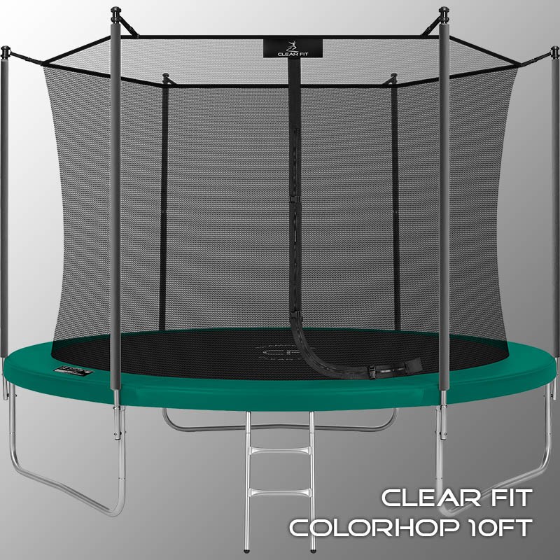Каркасный батут Clear Fit ColorHop 10Ft зеленый уличный спорт доставкаБатуты оснащены качественными пружинами и метизами. Внутренняя защитная сеть предотвращает падения, а 3-слойный мат и двойная молния с фиксатором входа обеспечивают дополнительную безопасность.