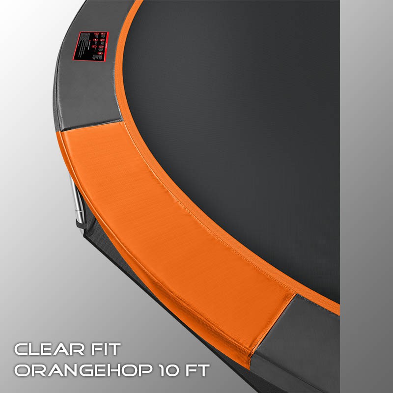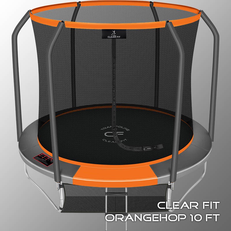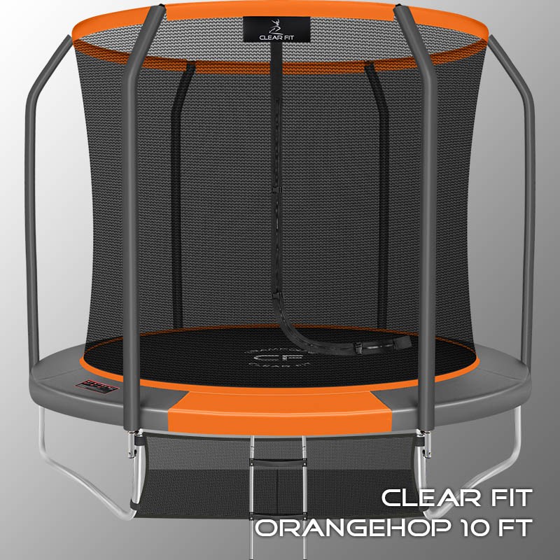 В 2026 году представлена обновленная линейка с улучшенной конструкцией каркаса. Усиление достигнуто за счет использования прочных Т-образных кронштейнов из металла толщиной 1.9 мм. Кроме того, в комплектацию добавлен карман для обуви. Каркасный батут с защитной сеткой Clear Fit серии OrangeHop — отличаются комфортом и надежностью. Надежная рама из качественных комплектующих, прочная защитная сеть снабжена прямым креплением к прыжковому полотну и дополнительной защитой входа, наверху каркасное жесткое крепление, сеть не провисает и не слетает во время тренировок. Увлекательный, полезный и безопасный тренажер для всей семьи. Батуты серии OrangeHop 10Ft, 12Ft, 14Ft и 16Ft поставляются в оптимальной для комфорта и безопасности комплектации: батут, верхняя защитная сеть, защитный мат, лестница и карман для обуви. Благодаря размеру батута в 10 футов и диаметру прыжковой поверхности 2.62 м он идеально подходит для дачного участка, размеры полотна позволяют комфортно тренироваться взрослым и развлекаться детям любого возраста. Верхняя защитная сеть оберегает от падений, усиленная молния и дополнительная защита входа уберегут малышей от случайного входа или падения. Надежный каркас из оцинкованной стали, качественные комплектующие и погодостойкие гальванизированные метизы рамы делают батут безопасным, устойчивым, надежным, гарантируют полную защиту от коррозии и долгий срок службы. Максимальный вес пользователя батута OrangeHop 10Ft — до 170 кг. Батуты OrangeHop предназначены не только для детских игр, но и для фитнеса. Благодаря инновационной системе крепления защитной сети значительно увеличено рабочее пространство и надежность конструкции. Тренировки на батуте — это отличная аэробная нагрузка: улучшение общей физической формы, заряд положительных эмоций, улучшение работы кардиоваскулярной системы, развитие чувства равновесия и координации в пространстве для пользователей любого возраста. Занятия на свежем воздухе укрепляют иммунитет, снабжают организм кислородом, повышают выносливость как у детей, так и у взрослых. Именно поэтому мы используем только высококачественные комплектующие с большим запасом прочности. В большинстве случаев батуты данного типа устанавливаются под открытым небом, обязательные требования к материалам — это влагостойкость, термоустойчивость, в том числе и к низким температурам, переносимость ультрафиолетовых лучей и износостойкость. Конструкция для обеспечения безопасности выполнена из гальванизированной стали, диаметр стальных труб W-опор и каркаса - 38 мм. Каркас из труб толщиной 1.2 мм соединяется с помощью мощных сварных Т-образных кронштейнов из металла толщиной 1.9 мм и высококачественных гальванизированных метизов. Качественная двойная оцинковка всех труб конструкции исключает коррозию, увеличивает срок эксплуатации батута. Прыжковое полотно — это основной элемент батута. Материал прыжкового полотна Перматрон (Permatron) — эластичный материал, способный возвращаться в исходное состояние при постоянном воздействии с разным усилием. Термообработка волокон материала обеспечивает высокую прочность на разрыв и стрессоустойчивость материала. Это влагостойкий, эластичный термоустойчивый материал, не поддающийся распаду от ультрафиолета. Пружины выполнены из гальванизированной стали толщиной 3 мм, устойчивы к ко