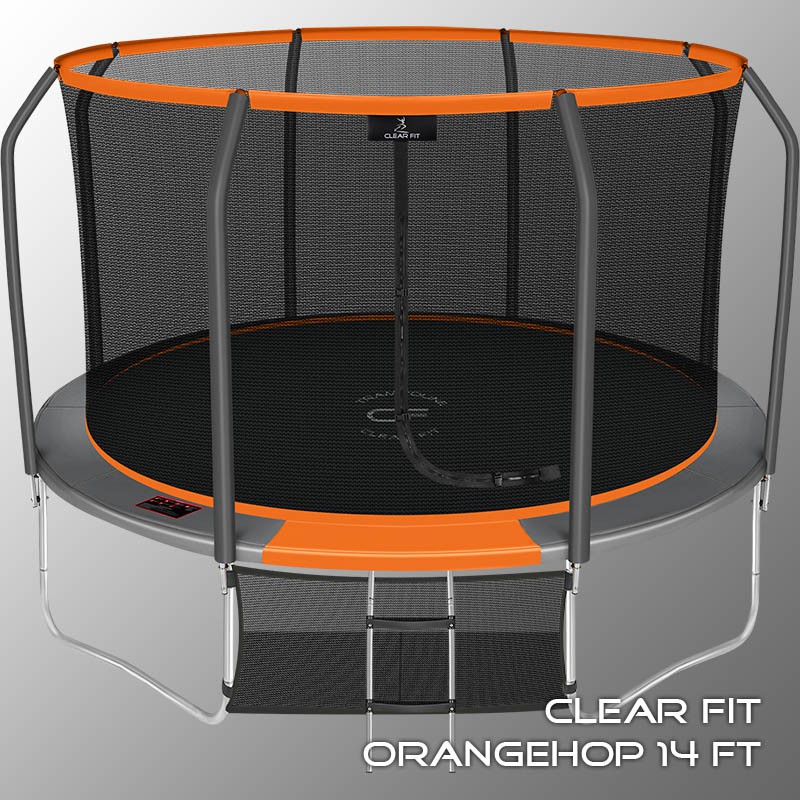 В 2026 году представлена обновленная линейка с улучшенной конструкцией каркаса. Усиление достигнуто за счет использования прочных Т-образных кронштейнов из металла толщиной 1.9 мм. Кроме того, в комплектацию добавлен карман для обуви. Каркасный батут с защитной сеткой Clear Fit серии OrangeHop — отличаются комфортом и надежностью. Надежная рама из качественных комплектующих, прочная защитная сеть снабжена прямым креплением к прыжковому полотну и дополнительной защитой входа, наверху каркасное жесткое крепление, сеть не провисает и не слетает во время тренировок. Увлекательный, полезный и безопасный тренажер для всей семьи. Батуты серии OrangeHop 10Ft, 12Ft, 14Ft и 16Ft поставляются в оптимальной для комфорта и безопасности комплектации: батут, верхняя защитная сеть, защитный мат, лестница и карман для обуви. Батут размером в 14 футов с прыжковой поверхностью 3.82 м идеально подходит для пользователей любого возраста и комплекции, для детских и подростковых игр, для спортивных тренировок и для фитнеса. Верхняя защитная сеть оберегает от падений, усиленная молния и дополнительная защита входа уберегут малышей от случайного входа или падения. Надежный каркас из оцинкованной стали, качественные комплектующие и погодостойкие гальванизированные метизы рамы делают батут безопасным, устойчивым, надежным, гарантируют полную защиту от коррозии и долгий срок службы. Максимальный вес пользователя батута OrangeHop 14Ft — до 250 кг.