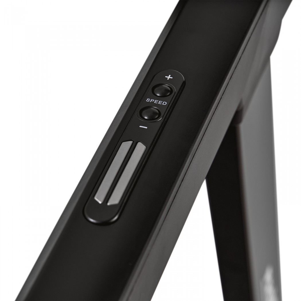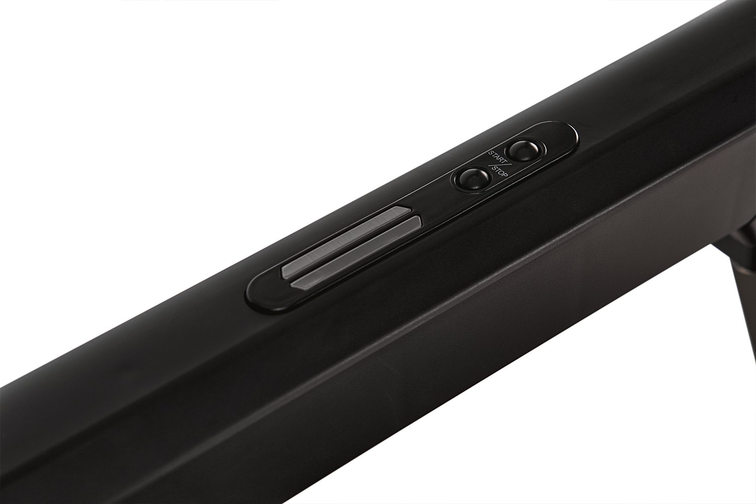 Дорожка оснащена двигателем Leeson мощностью2.25 л.с., способным развивать скорость движения полотна до16 км/ч. Перед установкой в тренажер, мотор прошел специальную процедуру балансировки и тестирования Рабочая поверхность бегового полотна размером 130 х45 см. Габариты полотна комфортны для эффективных занятий бегом или ходьбой. На дорожке используется система многозонной амортизации, состоящей из набора эластомеров и нескольких амортизаторов, эффективно снижает нагрузку на позвоночник, суставы коленей и голеностопа. Механическая регулировка угла наклона (3 уровня) позволит увеличить нагрузку на основные группы мышц. В программный пакет входит 40 предустановленные программы – пульсозависимые и целевые, также можно воспользоваться ручным режимом настройки программ. Во время тренировки все ключевые показатели - скорость, время, дистанция, калории, частоту пульса, текущий профиль выводятся на информативный 5 - дюймовый LCD дисплей. Сенсорные датчики на поручнях измеряют сердечный ритм. Кнопки регулировки скорости и наклона на рукоятках позволят менять нагрузку без отрыва от тренировки. Гидравлическая система складывания «JUST CLICK» существенно облегчает складывание тренажера, а при раскладывании обеспечивает медленное опускание полотна в последней фазе, гарантируя легкость и безопасность. Перемещение дорожки происходит за счет ряда транспортировочных роликов. Рама из высокопрочной стали и усиленные соединения обеспечат долговечность и устойчивость конструкции беговой дорожки. Предельная нагрузка на конструкцию140 кг. Общие характеристики