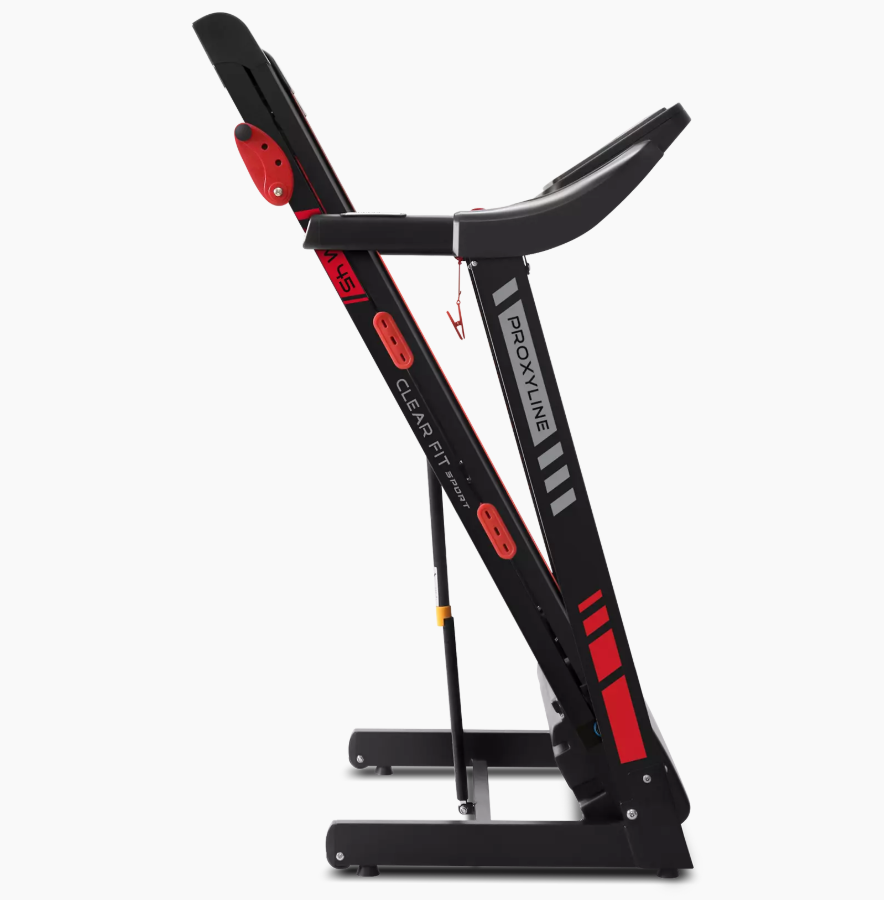 Беговая дорожка хорошего качества с доставкой Clear Fit Sport ProxyLine TM 45Оптимальная беговая дорожка Clear Fit Sport TM 45 серии ProxyLine предназначена для регулярных домашних тренировок. Электрическая беговая дорожка отличается просторным беговым полотном 450 х 1200 мм, это максимальный комфорт для любой комплекции при ходьбе и беге в диапазоне скорости 0,8 – 12 км/ч. Надежный, практически бесшумный двигатель 3.25 л.с. обеспечивает плавное изменение скорости и стабильное движение полотна. Прочная дека и усиленная конструкция рассчитаны для пользователей до 135 кг. Двойная система амортизации: SensibleCushion™ – 4 цилиндрических эластомера по периметру и ExtentCushion™ – 4 вытянутые подушки в центральной зоне, обеспечивают защиту от ударной нагрузки для суставов и позвоночника, подходит для всех возрастных групп пользователей. Регулировка угла наклона бегового полотна по технологии SlightChange осуществляется легко и безопасно, фиксируется в 3-х положениях. Газовый доводчик EasyDecline™ облегчает процесс складывания, обеспечивает плавное и мягкое опускание бегового полотна без усилий и шума, все для компактного хранения и простого перемещения тренажера. Продуманная эргономика модели, наличие полки для гаджетов и подстаканников для бутылки воды, интуитивное управление, крупная и русифицированная индикация позволяют легко начать регулярные домашние занятия спортом. Панель управления полностью русифицирована, яркий LСD дисплей 5” отображает все ключевые параметры тренировки: время, скорость, дистанция, калории и пульс. Консоль отличается простой, удобной системой навигации на русском языке, современным и лаконичным дизайном. Оптимальный пакет программ повышает эффективность тренировок, помогает сохранить мотивацию и интерес к занятиям: 23 разноплановых тренировок, включая пульсозависимые, аэробные, целевые программы и тест программу BodyFat. На поручнях расположены датчики пульса, также в консоль предустановлена функция HRC – возможность использования беспроводного нагрудного датчика пульса частотой 5 кГц, что обеспечивает беспрерывный вывод пульса на экран тренажера и повышает эффективность тренировок для укрепления кардиоваскулярной системы. Особенности