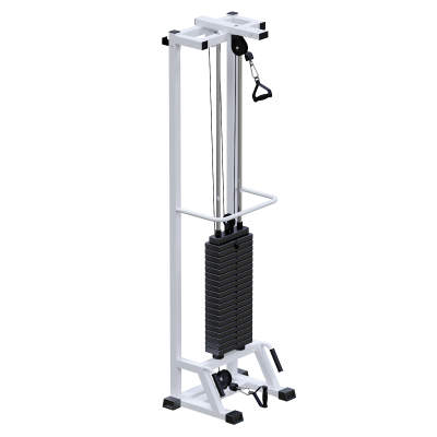 Свободное вращение верхнего и нижнего блоков обеспечивает естественную траекторию движения и адаптацию упражнений под индивидуальные задачи восстановления. Конструктивные преимущества Каркас тренажёра изготовлен из стального профиля 80×40 мм и 50×50 мм с толщиной металла 2 мм. Такая конструкция обеспечивает оптимальное сочетание жёсткости, устойчивости и компактности при профессиональной эксплуатации. Грузоблочный стек состоит из металлических обрезиненных плит по 5 кг с хромированными направляющими. Регулировка нагрузки осуществляется при помощи металлической иглы-фиксатора. Передача усилия реализована через трос диаметром 5 мм в ПВХ-оплётке с разрывным усилием 500 кг и допустимой рабочей нагрузкой до 800 кг, что формирует высокий запас прочности. Блоки работают на подшипниках качения закрытого типа, обеспечивая плавный ход и минимальный износ. Все металлические элементы окрашены порошковой термоотверждаемой краской, устойчивой к коррозии и механическим повреждениям. Монтажные планки позволяют при необходимости закрепить раму к стене. Амортизирующие подпятники из поливинилхлорида дают возможность установки без крепления к полу и эффективно снижают вибрационные нагрузки. Технические характеристики