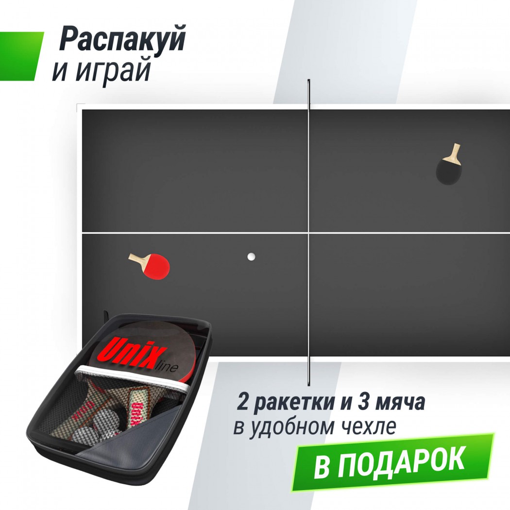 Столешница всепогодного стола UNIX Line изготовлена из SMС - панели с антибликовым покрытием и выдерживает многочисленные нагрузки, мм обладает хорошей устойчивостью к ударам, воздействию окружающей среды, влаге и температурным перепадам. Она не является горючим материалом, и за счет высокой плотности и толщины столешницы (14 мм) обеспечивает великолепный отскок мяча во время игры Металлическая рама теннисного стола UNIX Line имеет толщину стали 1,4 мм, размеры профилей составляют 20х40 и 40х40 мм. Благодаря таким характеристикам конструкции, теннисный стол сохраняет жесткость и устойчивость на любых покрытиях. Опоры теннисного стола оборудованы компенсаторами неровности. Для комфортного перемещения теннисный стол имеет 8 прорезиненных колес Ø75 мм с подшипниками. Все колеса маневровые и обладают высокой износостойкостью, 4 из них оборудованы фиксаторами. Сетка из нейлона с надежными фиксаторами, а также набор для игры в настольный теннис: 2 ракетки, 3 шарика в сумке, поставляются в комплекте со столом. Обращаем ваше внимание, что внешний вид изделия может отличаться в зависимости от наличия на складе. Тип Теннисный стол Назначение Для дома Толщина столешницы14 мм Материал столешницы SMC-плита Антибликовое покрытие есть Цвет столешницы Серый (5 слоев окраски) Возможность одиночной игры есть Фиксатор колес есть Цвет рамы черный Покраска рамы двойная (антикоррозийная) Особенности набор аксессуаров в комплекте Складная конструкция да Транспортировочные ролики 8 шт (4 шт со стопором), маневренные, обрезиненные, Ø75 мм Цвет Серый Размер в рабочем состоянии, см (ДхШхВ) 274 х 152,5 х 76 (стандарт ITTF) Размер в сложенном виде, см (ДхШхВ) 159 х 59 х 157 Габариты в упаковке, см 160 х 148 х 12 Вес в упаковке, кг 69 Объем упаковки (м³) 0,2916 Страна изготовления Китай Сетка есть Ракетки есть Мячики есть Комплектация теннисного стола сетка нейлон, 2 ракетки, 3 шарика Вес стола66 кг Гарантия на столешницу 1 год Производитель UNIX Line Гарантия 2 года Похожие товары