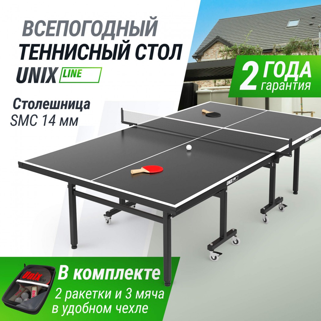 Всепогодный теннисный стол UNIX Line для улицы outdoor 14 мм SMC серый TTS14OUTGYВсепогодный стол для настольного тенниса UNIX Line Outdoor 14mm разработан специально для использования на площадках под открытым небом. Теннисный стол состоит из двух независимых половинок с технологией складывания Compact. Удобное складывание и жесткая фиксация столешницы позволяют играть одному.